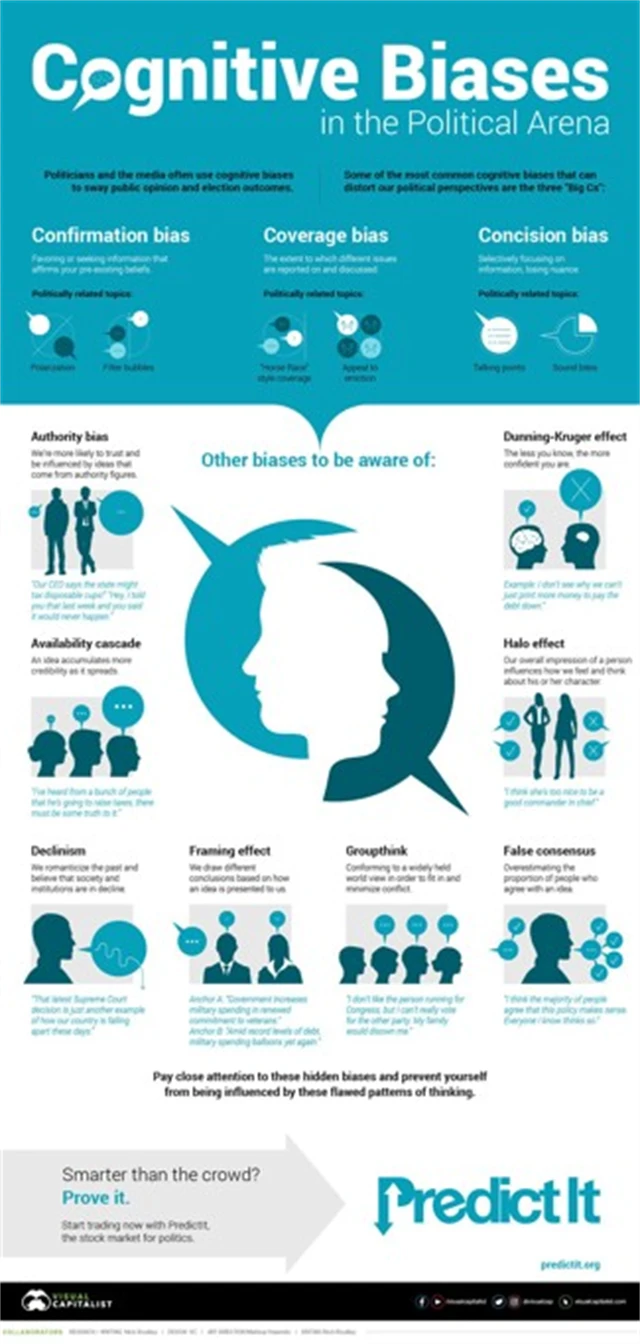 Přehled nejčastějších kognitivních zkreslení, s nimiž se lze setkat ve světě politiky a při předvolebních soupeřeních, nabízí přiložená infografika.