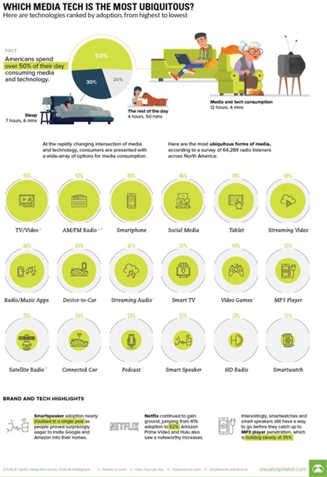 Pro nikoho asi nebude velké překvapení, že nejvíce Američanů sleduje pravidelně televizi, poslouchá rádio, zírá do mobilu nebo tabletu a visí na sociálních sítích.
