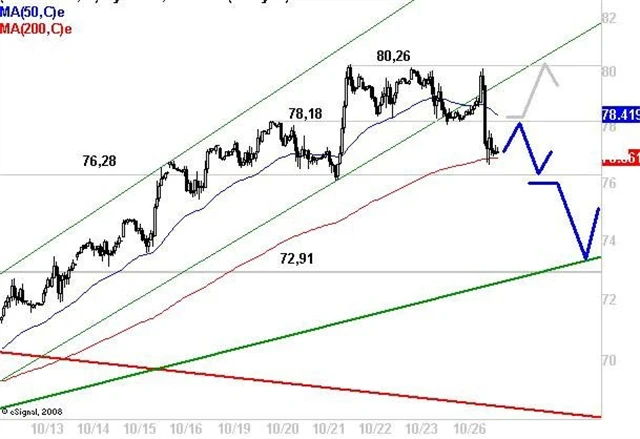 Na začátku obchodování cena ropy rostla, z úrovní 78,18 USD se vyšplhala až na maximum z pátku a to ho hodnotu 80,26 USD. Zde přišel prodej pozic, ropa dynamicky proletěla podporou a úrovni 78,18 USD, prolomila na hodinovém grafu vytvořený růstový trend a zastavila se až na ceně 76,28 USD.