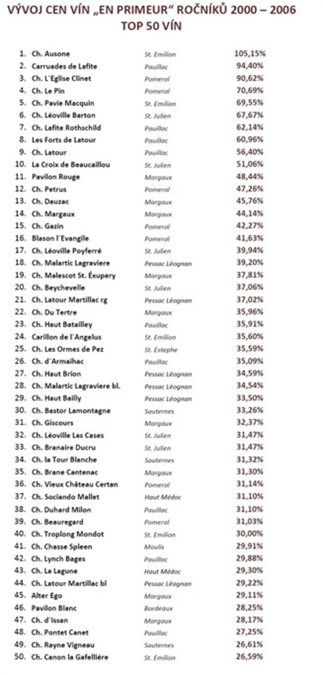 Tabulka zveřejňuje momentální výnos u vín z ročníků 2000 – 2006 nakoupených právě tímto způsobem, vzhledem k pořizovací ceně „En Primeur“ v daném ročníku.