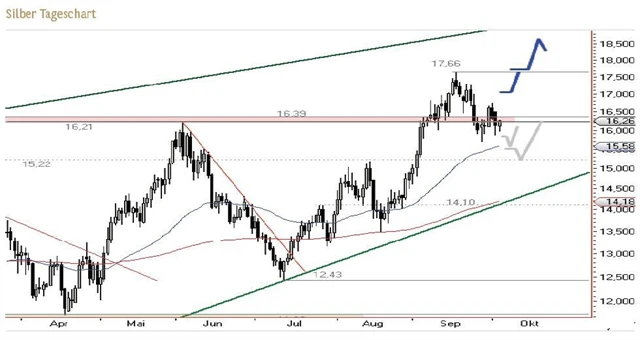 Stříbro se během rally, která proběhla od poloviny srpna do poloviny září dostalo až k novému ročnímu maximu 17,66 $. Přitom se vytvořila medvědí formace ramena-hlava-ramena, ale po jejím dokončení nenastal očekávaný pokles kurzu. Podpora na úrovní 16,21-16,39 $ byla sice prolomena, ale opět nenásledoval výraznější pokles ceny.