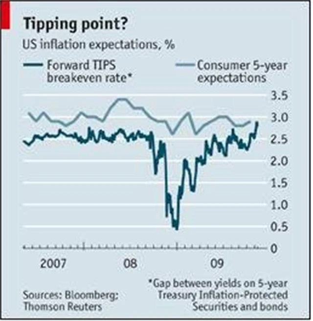 Ve Spojených státech například v září spotřebitelské ceny klesaly o 1,3 procenta, ale v prosinci by už měly růst zhruba o 3 procenta. I kdyby se ropa udržela okolo 80 dolarů za barel, inflace ve Spojených státech se zřejmě udrží nad dvěma procenty celé první pololetí 2010. Podle mnohých ceny ropy dál porostou – Goldman Sachs předpokládá na konci příštího roku cenu zhruba 95 dolarů za barel a dlouhodobé futures koketují s hranicí sta dolarů za barel.