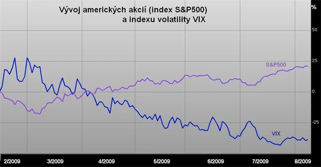 Index kolísavosti (volatility) amerických akcií. Podle agentury Bloomberg se indexy S&P500 a VIX pohybovaly ve vzájemně opačném směru v 81 procentech případů, během posledních pěti let (pozn. když roste VIX, klesá index akciový index S&P500)
