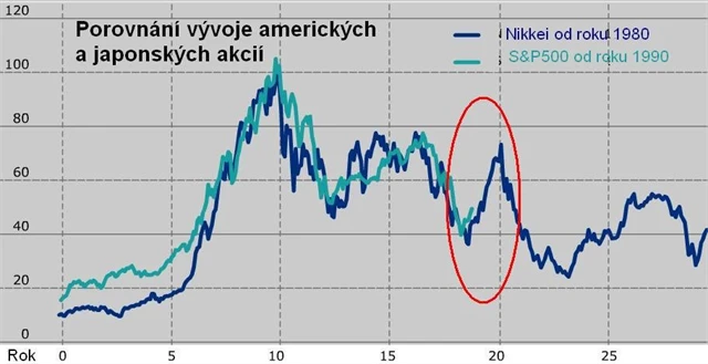 Jak dobře ilustruje graf vývoje hlavního indexu japonských akcií Nikkei 225 během poslední dvou desetiletí, tak se hodnota tohoto indexu mezi říjnem 1998 a dubnem 2002 zdvojnásobila (pozn. v dolarovém vyjádření). Americký index S&P500 od března 2009 posílil zatím o 34 %.