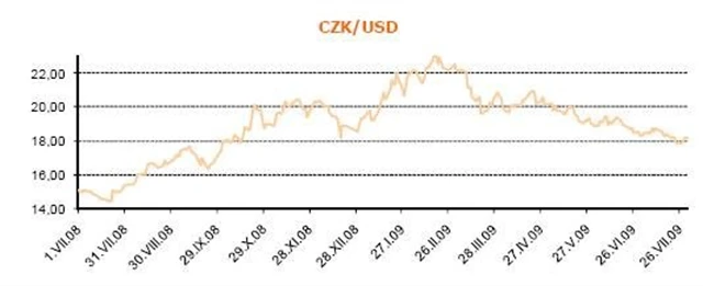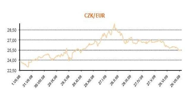 Vzhledem ke globálnímu vývoji nečekáme, že by se česká ekonomika odrazila ode dna dříve než na konci tohoto roku. Předpokládáme návrat k hodnotám kolem 25,00 CZK/EUR nejdříve začátkem roku 2010, kdy by již mohly být vidět náznaky oživení.
