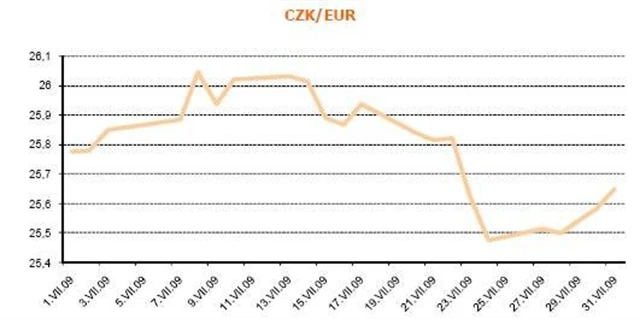Volatilita se v červenci na devizovém trhu opět zvýšila. Během první poloviny měsíce jsme viděli korunu pohybující se blízko hranice 26,00 CZK/EUR. Ve druhé půlce měsíce však koruna výrazně posilovala. Během týdne se dostala z hladiny 26,00 CZK/EUR až pod 25,50 CZK/EUR, kde se s menšími výkyvy udržuje až do konce měsíce.