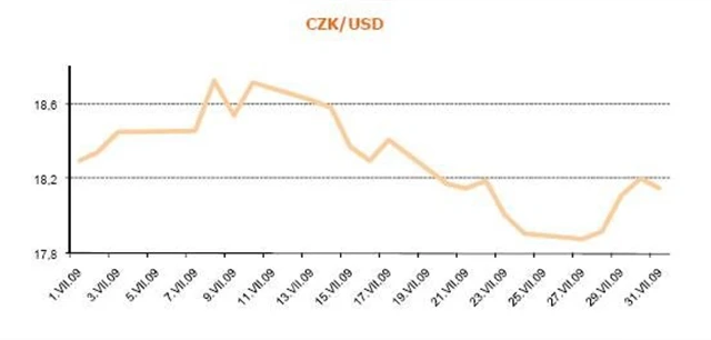 Koruna se vůči americkému dolaru držela v první polovině měsíce na slabších úrovních mezi 18,75 – 18,30 CZK/USD. V druhé polovině července postupně posílila, ruku v ruce s výrazným posílením na CZK/EUR, v závěru měsíce se dostala až k úrovni 17,80 CZK/USD. To je zatím letošní nejsilnější hodnota. Vůči euru se dostal téměř na 1,4300 USD/EUR.