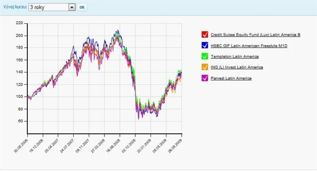 Z grafu výkonnosti vyplývá, že před vypuknutím finanční krize se dařilo překonávat konkurenci zejména fondu HSBC GIF Latin America Freestyle, zatímco po pádu Lehman Brothers se do popředí dostává především fond Templeton Latin America. Rozdíly jsou ovšem nepatrné.