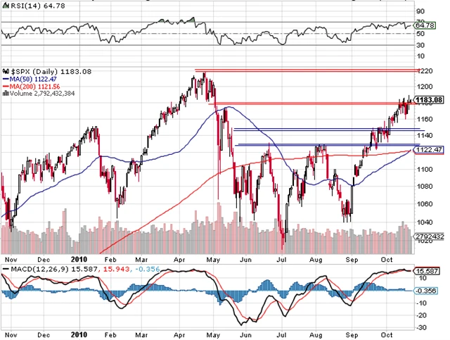 S&P 500 je nad 20denním klouzavým průměrem, který je nyní na hodnotě 1 160, což byla také čtvrteční nejnižší cena, a je to první hladina současného odporu. Po ní následuje široká oblast 1 150 až 1 130. Rezistence, hladina, která se snaží zpomalit nebo obrátit růst, je na hodnotách 1 180 až 1 220.