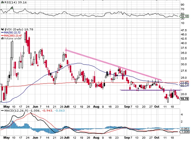 Index volatiliy VIX je stále pod hladinou 21. Několikrát se nad ni sice podíval, ale ani při úterním poklesu zde nedokázal uzavřít. Index potvrzuje střednědobý býčí trend.