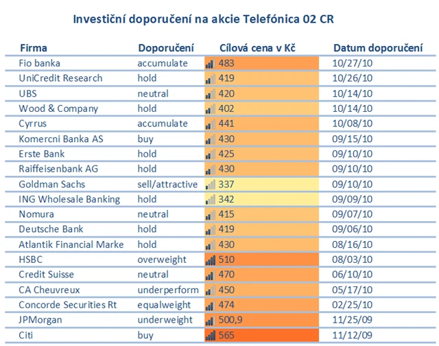 Jaký názor mají na akcie Telefóniky 02 ČR domácí a zahraniční analytici? Jaké jsou jejich dvanáctiměsíční cílové ceny a jak znějí jejich aktuální investiční doporučení? Přehled doporučení pro akcie Telefóniky 02 ČR, jak je shromáždila k 29. 10. 2010 agentura Bloomberg.