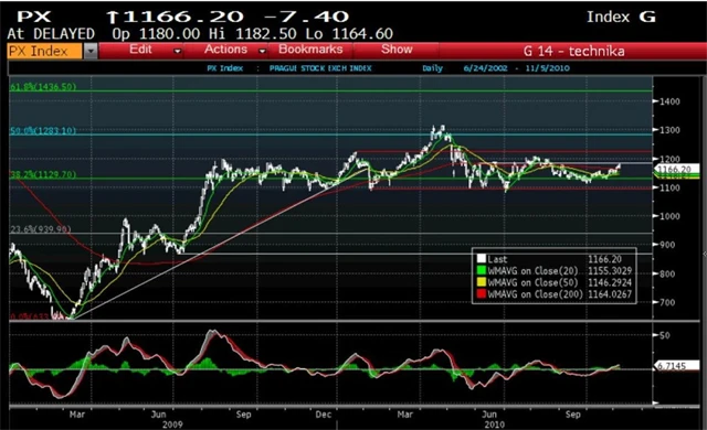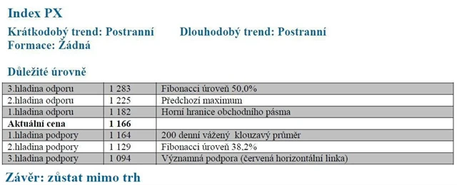 Pražská burza se chová trochu jinak než ostatní trhy, na růst na vyspělých trzích reaguje slabě, pokud vůbec, a volatilita akcií patřících do indexu PX je v poslední době také nebývale nízká. To vše znamená, že index PX je již určitou dobu v konsolidaci, lépe řečeno ve stagnujícím směru. Trh bez trendu se drží nad podporou 1 129 bodů.