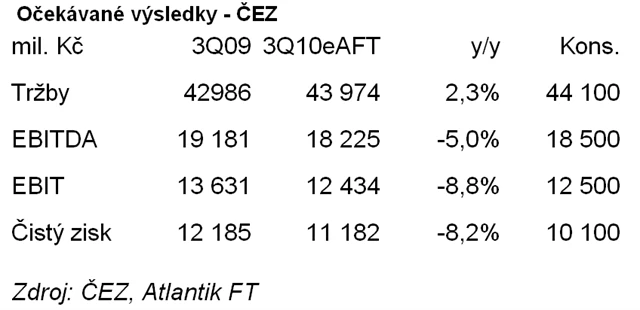 ČEZ zveřejní své konsolidované výsledky za 3Q2010 v úterý 9. listopadu před otevřením trhu v 8:00. Třetí čtvrtletí je sezonně slabší. Společnost Atlantik FT odhaduje, že i v meziročním srovnání by ČEZ měl oznámit horší čísla (kromě výnosů).