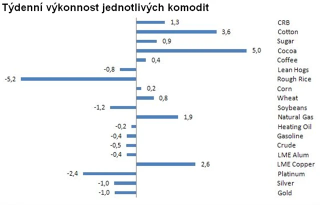 Nejlepší výkon za uplynulé dva týdny předvedlo kakao, především díky nejistotě pramenící z nedávných voleb v Pobřeží Slonoviny. Dále zaujaly měď (díky obavám z nedostatku nabídky v roce 2011 v kombinaci s uvedením měděného ETF) a zemní plyn, kterému pomohlo chladné počasí.