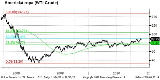Ropa WTI následovala minulý týden evropskou ropu Brent nad 90 dolarů. Maxima dosáhla na ceně 90,76 USD, poté investoři vybrali zisky a ropa se propadla o 3 procenta. Tento růst znamenal dosažení 50procentní úrovně návratu z výprodeje, kdy ropa klesla ze 147,27 na 33,20. Zajímavostí je, že tento propad se udál během 97 dní, přičemž návrat na polovinu zatím trval 663 dní.