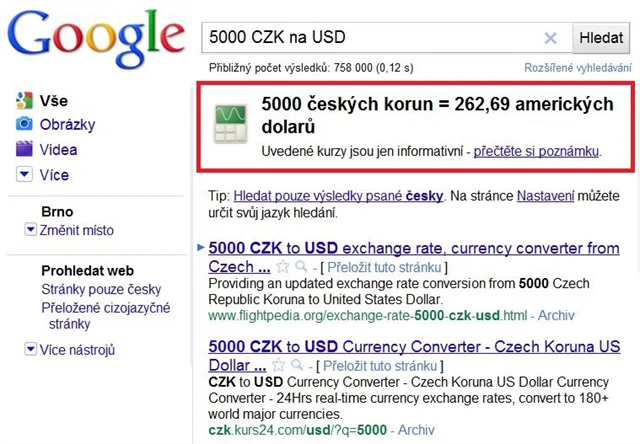 Google má několikaletý náskok před konkurencí. Příkladem je automatická měnová kalkulačka. Takto to například vypadá, když dáte vyhledat "5000 CZK na USD".