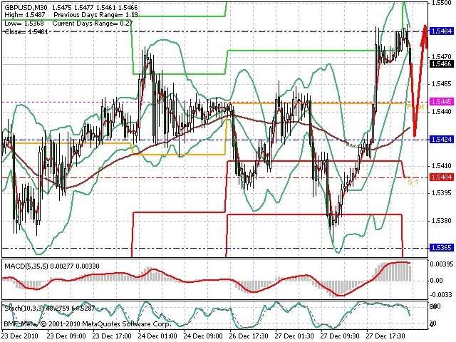 Předpokládaný pohyb pro dnešní den LONG. Případné vstupy do obchodu z hladiny 1.5425 s předpokládaným cílem 1.55, případně až 1.5535. Proražení hladiny 1.5425 může vést k pohybu s pravděpodobným cílem 1.5375 až 1.5355.