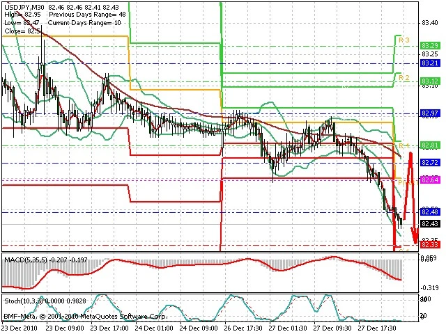 Předpokládaný pohyb pro dnešní den SHORT. Případné vstupy do obchodu z hladiny 82.8 s předpokládaným cílem 82.3, případně až 82.15. Proražení hladiny 82.8 může vést k pohybu s pravděpodobným cílem 83.0 až 83.2.