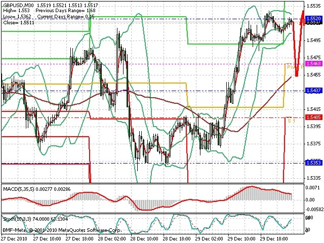 Předpokládaný pohyb pro dnešní den LONG. Případné vstupy do obchodu z hladiny 1.545 s předpokládaným cílem 1.555, případně až 1.558. Proražení hladiny 1.545 může vést k pohybu s pravděpodobným cílem 1.54 až 1.5355.
