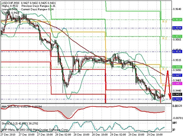 Předpokládaný pohyb pro dnešní den SHORT. Případné vstupy do obchodu z hladiny 0.949 s předpokládaným cílem 0.94, případně až 0.937. Proražení hladiny 0.949 může vést k pohybu s pravděpodobným cílem 0.9535 až 0.957.