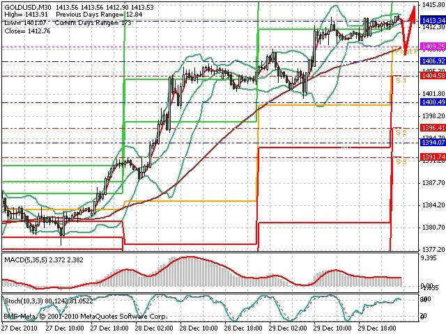 Předpokládaný pohyb pro dnešní den LONG. Případné vstupy do obchodu z hladiny 1 407.5 s předpokládaným cílem 1 420, případně až 1 425. Proražení hladiny 1 407.5 může vést k pohybu s pravděpodobným cílem 1 402 až 1 395.