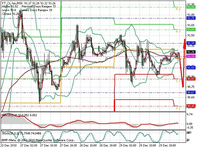 Předpokládaný pohyb pro dnešní den LONG. Případné vstupy do obchodu z hladiny 90.75 s předpokládaným cílem 91.5, případně až 91.88. Proražení hladiny 90.75 může vést k pohybu s pravděpodobným cílem 90.35 až 90.0.