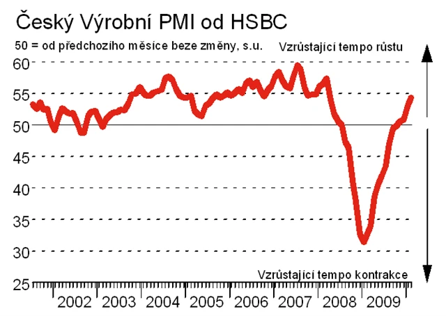 Hlavní Výrobní PMI pro Českou republiku od HSBC je složený jednociferný indikátor celkového výkonu výrobního sektoru. Hodnota nad 50,0 vyjadřuje celkové zlepšení podmínek odvětví výroby. V únoru byl PMI nad základní hodnotou 50,0 již čtvrtý měsíc v řadě, když vystoupil na hodnotu 54,3. To bylo signálem nejvýraznějšího celkového rozvoje sektoru od března 2008.