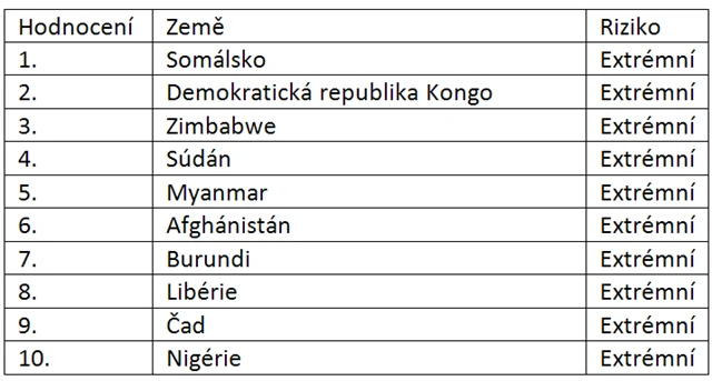 Společnost Maplecroft analyzovala 26 nejzávažnějších nefinančních rizik v mezinárodním obchodě a sestavila žebříček nejnebezpečnějších zemí.