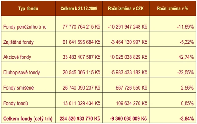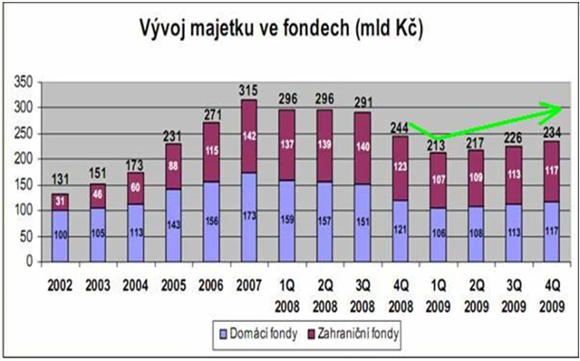 "Krizový rok 2009 fondy zvládly poměrně úspěšně," říká Jana Michalíková, výkonná ředitelka Asociace pro kapitálový trh (AKAT), a dodává: "Hodnota prostředků ve fondech byla na konci roku 2009 234 mld. Kč, což je jen o 9 mld. méně než v roce předchozím."