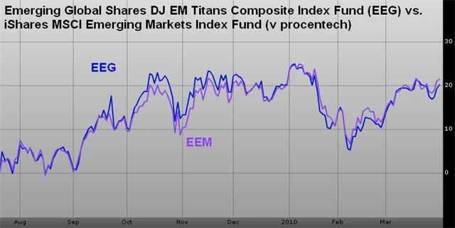 Indexový fond mladých trhů Dow Jones Emerging Markets Titans Composite (EEG) se od svého založení loni v červenci vyvíjí podobně jako fond sledující index MSCI Emerging Markets (EEM). Dow Jones Titans Index však roste i klesá o něco prudčeji než MSCI EM.