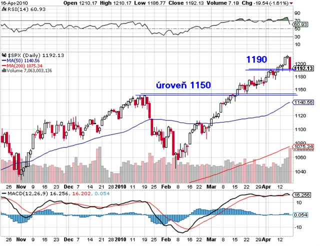 V minulém týdnu ceny do čtvrtka rostly. V pátek začala dlouho očekávaná, zdravá korekce a index S&P 500 uzavřel den se ztrátou 1,61 %. Celkově týden uzavřel o 0,2 % níže. Páteční pokles začal ještě před ohlášením problémů okolo Goldman Sachs, přestože General Electric a Bank of America ohlásily lepší než očekávané výsledky. Jak vypadá trh po technické stránce? (18. 4. 2010)