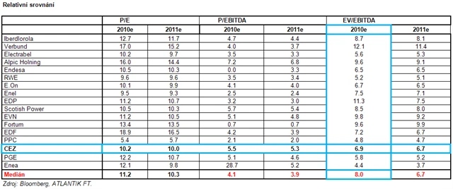 Pokud se podíváme na akcie ČEZ optikou roku 2010, kde je již prakticky jistá provozní výkonnost společnosti (rozprodáno skoro 100 % výroby za zveřejněnou cenu), akcie ČEZ se dle ukazatele EV/EBITDA (bere v potaz úroveň zadluženosti jednotlivých společností, ČEZ je stále relativně málo zadlužený) aktuálně obchodují s diskontem vůči sektoru.