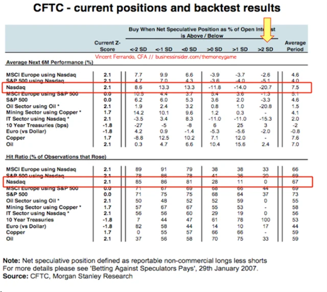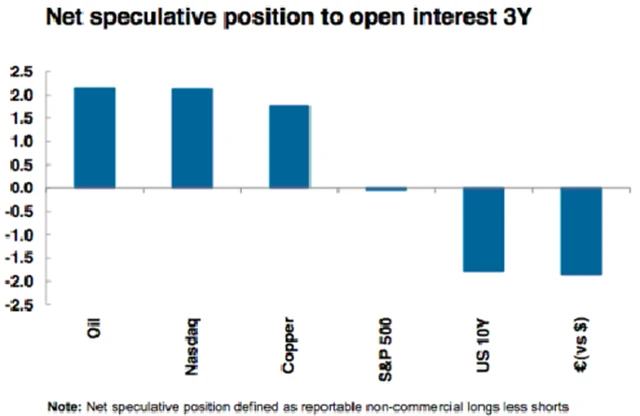 Spekulativní pozice vyjádřené jako procenta open interest jsou podle Morgan Stanley o více než dvě standardní odchylky nad průměrem úrovní ropy a Nasdaqu. Silná spekulativní činnost je vidět také na mědi.