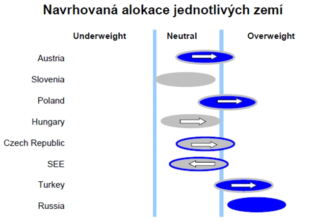 Turecko i Rusko jsou v pozici "overweight". Pokud jde o Rusko, představují ceny ropy (a dalších komodit) sice křehký, avšak stále platný scénář. Může zde dojít k menšímu zpomalení ve vazbě na příliv finančních prostředků. Turecko jako druhý největší trh v regionu doposud trpí důsledky politických turbulencí, avšak ve srovnání s Ruskem na něj analytici Erste Group sázejí jako na vítěze.