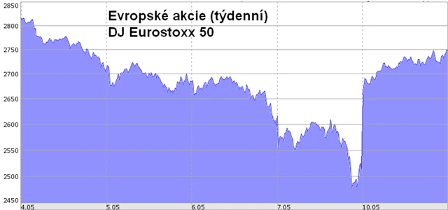 Hlavním rizikem pro růst akcií byly a jsou obavy z rozšíření dluhové krize. Tlak zejména na dluhopisové trhy Řecka, Španělska a Portugalska přiměl EU a ECB pracovat přes víkend. V pondělí po otevření trh na přijetí mimořádných opatření zareagoval prudkým růstem.