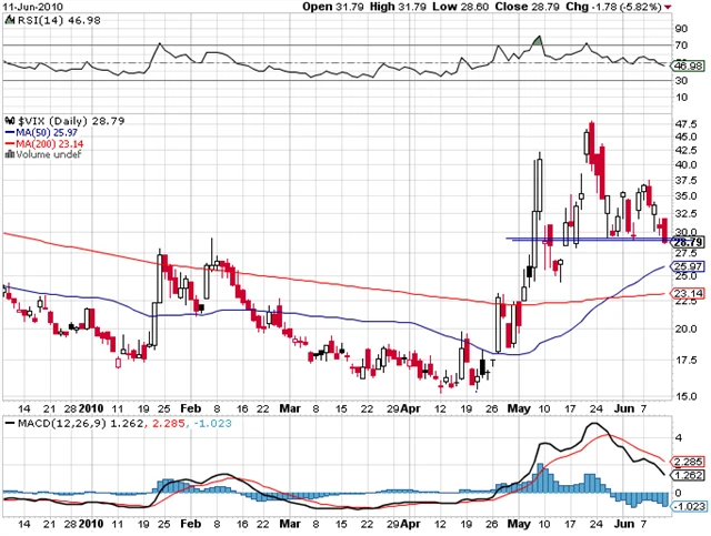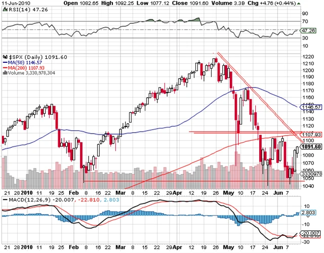 Minulou středu byl support na úrovni 1 040 bodů u indexu S&P 500 znovu otestován a "vydržel" i počtvrté. Ve čtvrtek, kdy proběhla výrazná rally, byl dosažen 20denní klouzavý průměr a v pátek přes počáteční propad po otevření trhů den nakonec uzavřel v zisku, i když objemy obchodů byly nevýrazné. To není neobvyklé, že při medvědím trendu se cena dostane mírně nad tento klouzavý průměr. (13. 6. 2010)