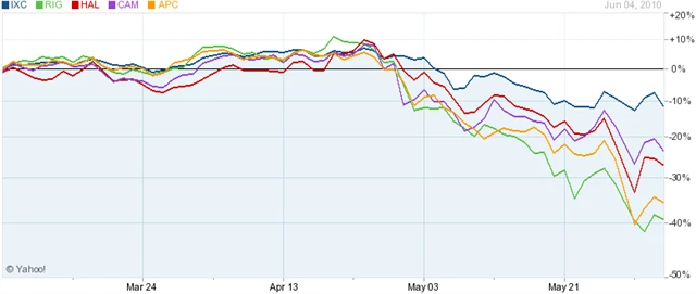 Od 20. dubna, kdy došlo na plošině k explozi, klesají akcie všech těchto firem, nemluvě o korekci na akciovém trhu jako takovém. Společnosti dosud přišly o téměř 111 miliard dolarů, nejhůře je na tom samozřejmě BP.