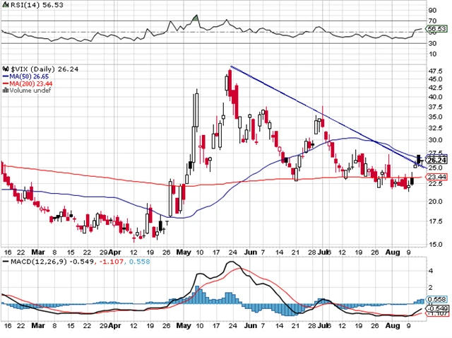 Index volatility VIX se do středy obchodoval ve velmi úzkém pásmu 22 až 23 bodů a index S&P 500 v rozmezí 1 120 až 1 130. Ve středu VIX "vyskočil" nad hladinu 25 a dostal se nad sestupnou, downtrendovou čáru. Jeho růst ovšem neprobíhal tak prudce jako pokles S&P 500. Pro potvrzení medvědího signálu u VIX je třeba ještě počkat. Ten by mohl nastat, až cena uzavře nad 27.