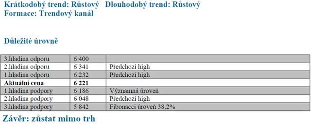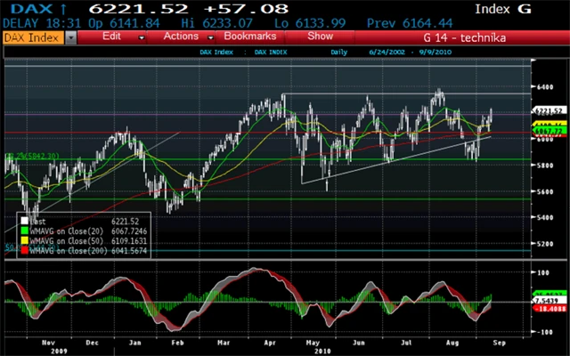 DAX je růstovější než ostatní indexy a úspěšně překonal 200denní vážený klouzavý průměr, což mu otevírá prostor na případný růst. Otázkou zůstává, zda lze DAX brát jako "předstihový index". Index MACD zatím neříká nic o tom, že by se současný lehce růstový trend měl otočit.