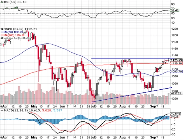 Index S&P 500 se dostal k ceně 1 130 a celý týden uzavíral nad 200denním klouzavým průměrem. Stejná situace byla také v červnu a srpnu. V pátek se cena dokonce intradenně dostala nad 1 130, ale vrátila se zpět. Důvodem, proč k proražení nemusí dojít v nejbližších dnech, je to, že podmínky na trzích jsou velmi překoupené.