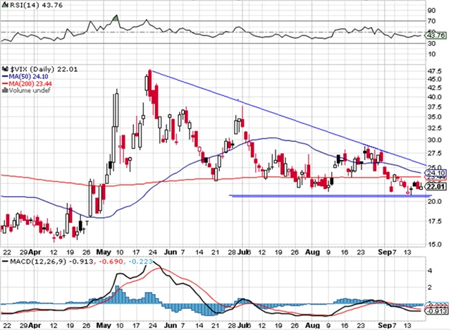 Index volatility VIX je v downtrendu, což je také býčí signál. Na svém minimu byl v úterý. Následně pak v pátek uzavřel nad cenou 22 a vrátil se do svého předchozího rozpětí 22 až 28.