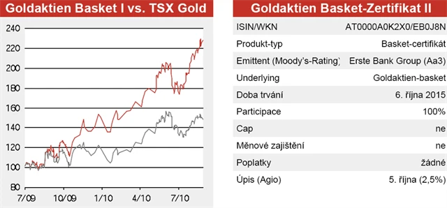 Již v červenci 2009 vydala Erste Bank Goldaktien Basket-Zertifikat. Struktura je totožná. Jediný rozdíl je ten, že koš obsahuje minimálně sedm, maximálně jedenáct kanadských titulů. Výnos je oslnivý: 126,3 procenta od počátku emise.