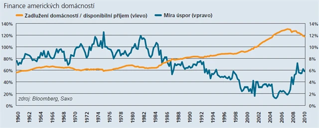 Americká ekonomika v roce 2011 sice poroste, ale neměli bychom se nechat unést přílišným optimismem. Nezaměstnanost zůstane nadále velmi vysoká, i když ke konci roku by mohlo dojít k jistému poklesu. Mnoho spotřebitelů se bude v důsledku tohoto vývoje nadále snažit snížit svoji zadluženost i v situaci, kdy ostatní začnou utrácet více. Celkově platí, že abychom v nadcházejícím roce zaznamenali rozumný růst, který Saxo Bank (SB) předpovídá, bude se muset rychlost oddlužování snížit. Velkou neznámou pro rok 2011 zůstává, zda pro amerického spotřebitele skutečně nastávají nové časy, nebo zda se jeho chování zase rychle vrátí zpět do vyjetých kolejí. Jedná se o "nový standard", nebo bylo období let 2008 až 2010 prostě jen přestávkou, po níž se USA opět vrátí ke "starým dobrým časům", kdy se míra úspor pohybuje kolem 2 až 3 % a kdy každý musí mít iPad?