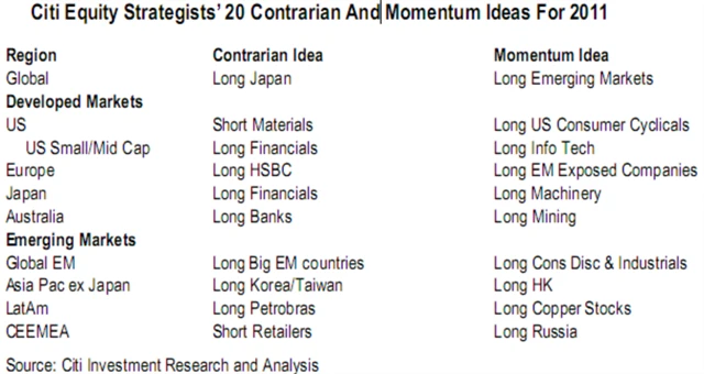 Banka Citigroup oslovila svých 20 akciových stratégů, které má po světě, aby dali na stůl své investiční nápady pro rok 2011. Tentokrát však šlo o doporučení, která by měla jít zaprvé proti proudu (contrarian), a zadruhé by měla zafungovat na základě aktuální nálady (momentum) na trzích.