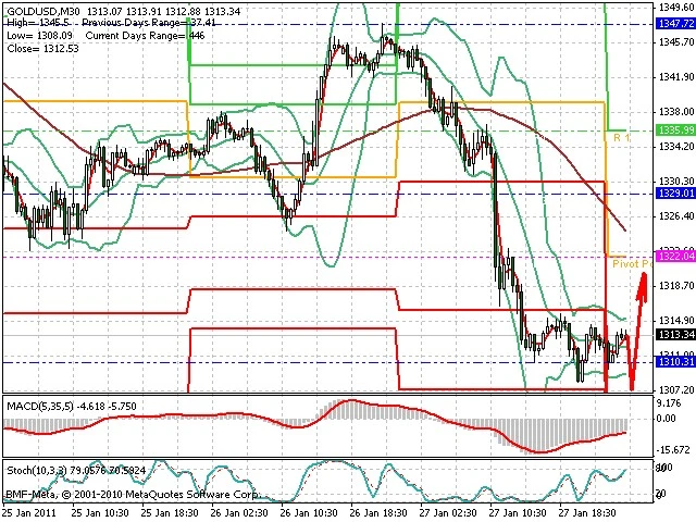 Předpokládaný pohyb pro dnešní den LONG. Případné vstupy do obchodu z hladiny 1 307 s předpokládaným cílem 1 320, případně až 1 325. Proražení hladiny 1 307 může vést k pohybu s pravděpodobným cílem 1 296 až 1 285.