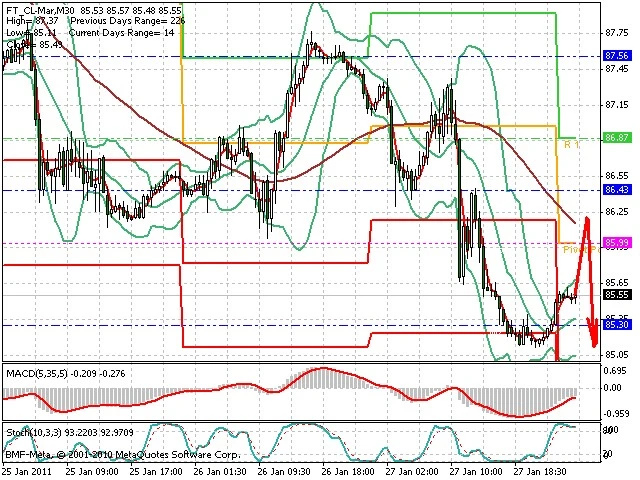 Předpokládaný pohyb pro dnešní den SHORT. Případné vstupy do obchodu z hladiny 86 s předpokládaným cílem 84, případně až 82.1. Proražení hladiny 86.45 může vést k pohybu s pravděpodobným cílem 87.8 až 89.