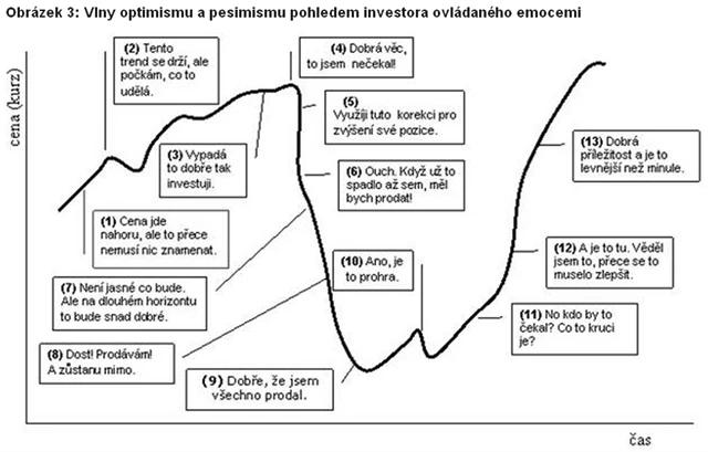 Když vládne optimismus, dostavuje se vzrušení a rozechvění. V dobách euforie jsou ceny nejvýše, i když z pohledu racionálního je to bod největšího finančního rizika. Když pak ceny padají, nastupuje strach, popření, to je střídáno beznadějí, panikou a kapitulací.