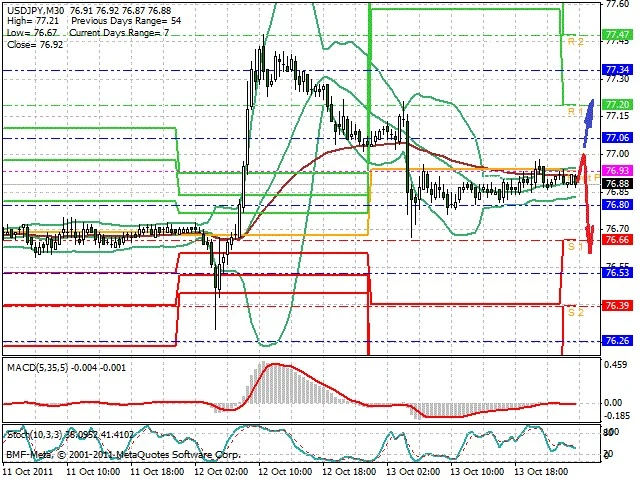 Předpokládaný pohyb pro dnešní den SHORT. Případné vstupy do obchodu z hladiny 77 s předpokládaným cílem 76.6, případně až 76.5. Proražení hladiny 77.05 může vést k pohybu s pravděpodobným cílem 77.2 až 77.4.