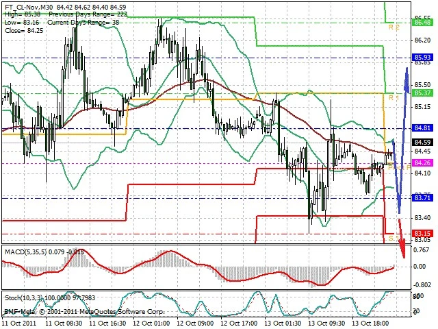 Předpokládaný pohyb pro dnešní den LONG. Případné vstupy do obchodu z hladiny 83.5 s předpokládaným cílem 85.65 případně až 86.75. Proražení hladiny 83.5 může vést k pohybu s pravděpodobným cílem 82 až 81.5.