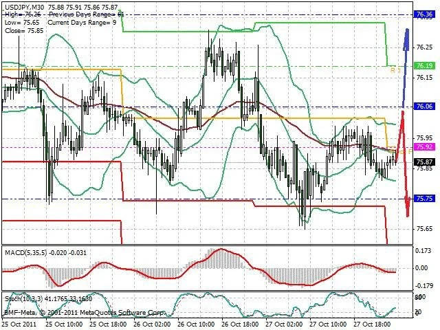 ředpokládaný pohyb pro dnešní den SHORT. Případné vstupy do obchodu z hladiny 76.05 s předpokládaným cílem 75.7, případně až 75.4. Proražení hladiny 76.05 může vést k pohybu s pravděpodobným cílem 76.3 až 76.5.